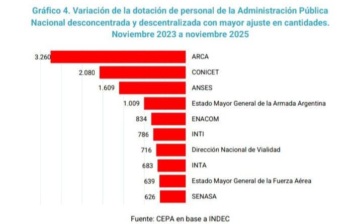 Detallo ademas que "en el ámbito de la Administración Pública Nacional (APN), que incluye organismos desconcentrados y descentralizados, el caso más significativo en términos absolutos es el de ARCA, con 3.260 puestos de trabajo eliminados. Le siguen la CONICET, con 2.080 despidos, y el ANSES, con una reducción de 1.609 trabajadores".