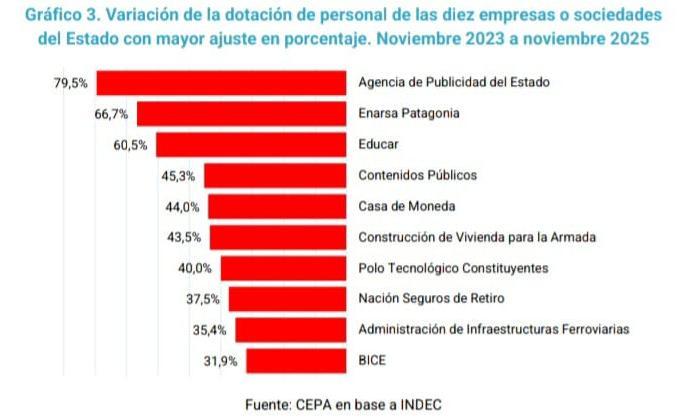 " En términos proporcionales, el recorte más drástico se dio en la ex Télam, donde se despidió a cerca del 80% del y luego los casos de Educar S.A. y Contenidos Públicos S.E., que también presentan reducciones especialmente significativas", apuntó.