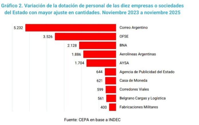 "El análisis por empresa muestra que el caso más significativo en términos absolutos es el del Correo Argentino, que encabeza el listado con 5.232despidos. Le siguen la Operadora Ferroviaria S.E., con 3.526 cesantías, yBanco Nación, con 2.128 despidos, mientras que el Aerolíneas Argentinas registra 1.886 desvinculaciones", indicó.