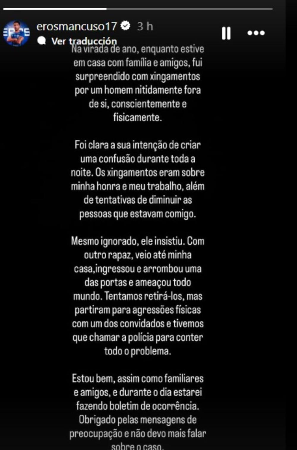 El propio Mancuso utilizó sus redes sociales para dar su versión y destacar que tanto él como sus acompañantes y familiares están bien tras el incidente, aunque anunció que presentará la denuncia correspondiente ante las autoridades locales.