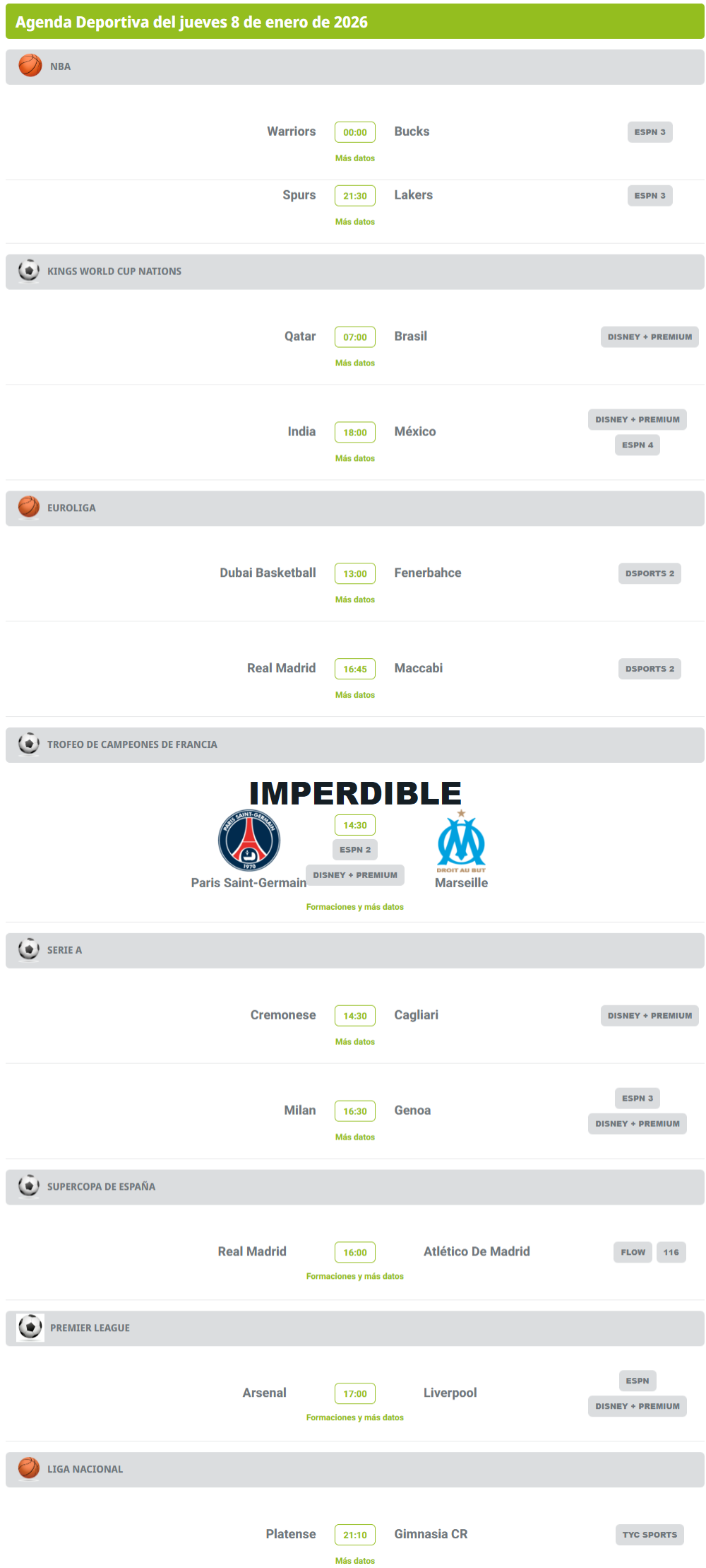 Agenda deportiva: hora y dónde ver los partidos de este 8 de enero Agenda deportiva: hora y dónde ver los partidos de este 8 de enero
