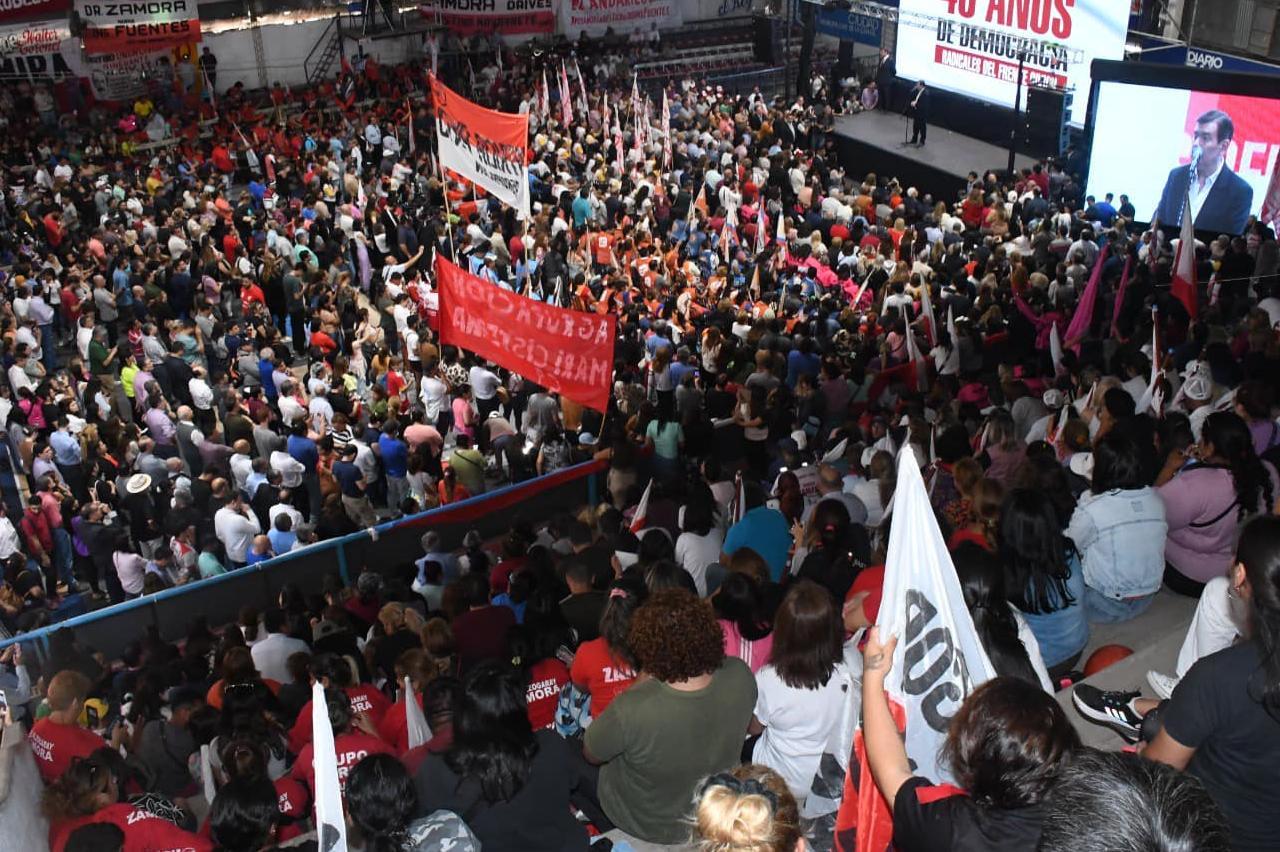 Y expresó: "Yo quiero enviar desde este encuentro con banderas rojas y blancas del radicalismo de Santiago del Estero, un mensaje a todos los hombres y mujeres, desde este estadio, que lo respetan a don Raúl y que lo respetan como 'Padre de la Democracia', que el 19 de noviembre pongamos todos sus valores en las urnas, porque queridos correligionarios, la grieta en la Argentina se terminó si el 19 de noviembre, el voto es amor, esperanza, y unidad, todos juntos los argentinos, todos juntos los santiagueños".