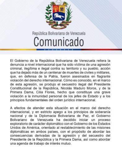 En el comunicado, el gobierno venezolano reiteró su denuncia contra lo que calificó como una "agresión criminal, ilegítima e ilegal" contra su territorio y su pueblo, en referencia a operaciones recientes que involucraron a fuerzas estadounidenses y la captura del expresidente Nicolás Maduro y su esposa, Cilia Flores. Señaló que el proceso diplomático que se inicia tiene como propósito atender las consecuencias de esos hechos "en el marco del derecho internacional y en estricto apego a los principios de soberanía nacional y de la Diplomacia Bolivariana de Paz".