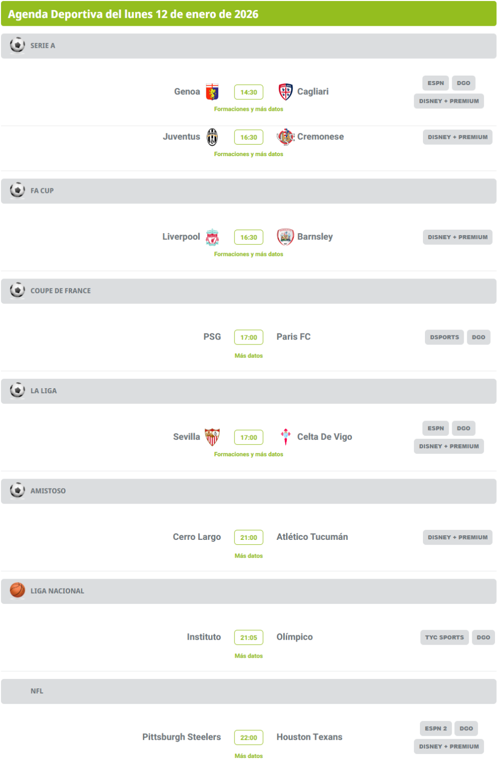 Agenda deportiva: hora y dónde ver los partidos de este 12 de enero Agenda deportiva: hora y dónde ver los partidos de este 12 de enero
