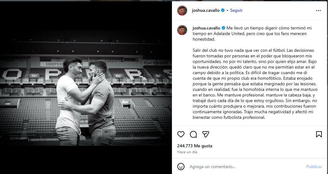 "Salir del club no tuvo nada que ver con el fútbol", escribió Cavallo en un extenso posteo en su cuenta de Instagram. "Se tomaron decisiones por parte de personas con poder que bloquearon mis oportunidades. No fue por mi talento, sino por a quién elijo amar", aseguró el futbolista, apuntando directamente a la dirigencia del Adelaide United.