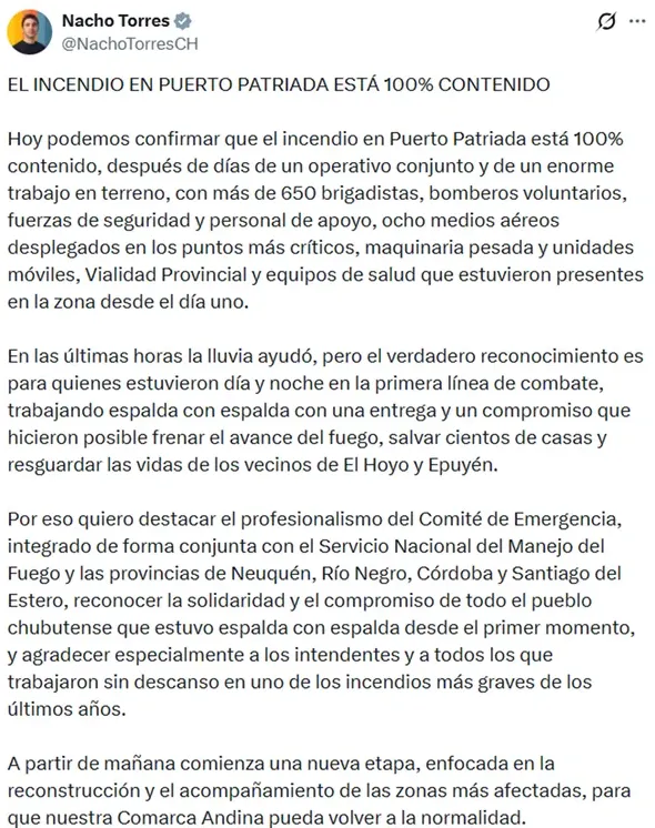 "Hoy podemos confirmar que el incendio en Puerto Patriada está 100% contenido", aseguró Ignacio Torres luego de varios días de combate ante devastadoras llamas.
