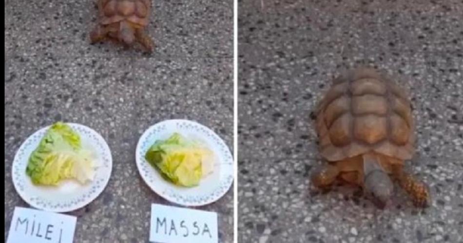 En este caso, las opciones fueron los nombres de los candidatos de Unión por la Patria y La Libertad Avanza. Rumbo al balotaje, la tortuga le puso mucho suspenso pero finalmente se decidió y eligió el plato "ganador". ¿Volverá a acertar?