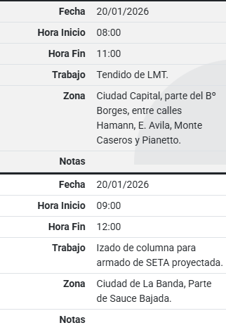 Este martes 20 de enero se realizarán cortes programados de energía eléctrica en Santiago del Estero. La medida forma parte de tareas de mantenimiento y trabajos técnicos que la empresa distribuidora ejecutará para mejorar el servicio en distintos sectores de la provincia.