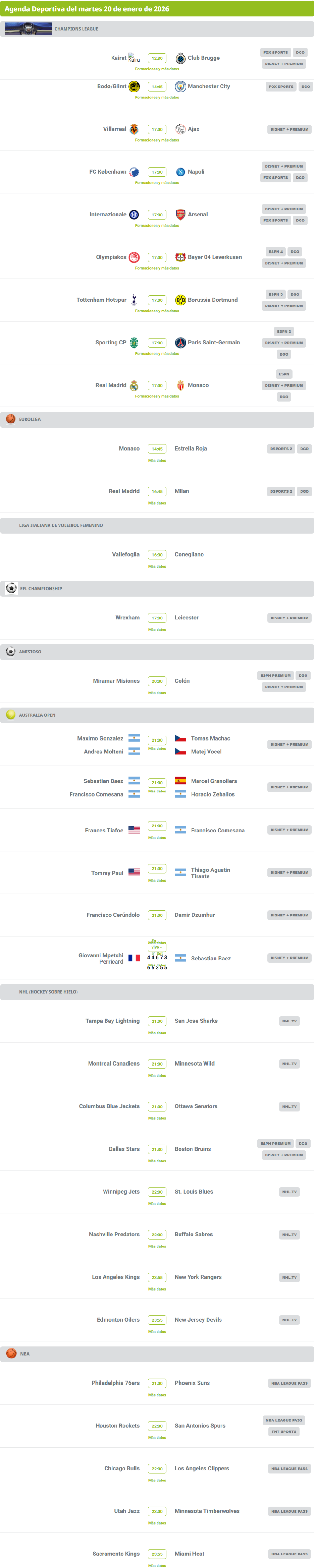 Agenda deportiva: hora y dónde ver los partidos de este 20 de enero Agenda deportiva: hora y dónde ver los partidos de este 20 de enero