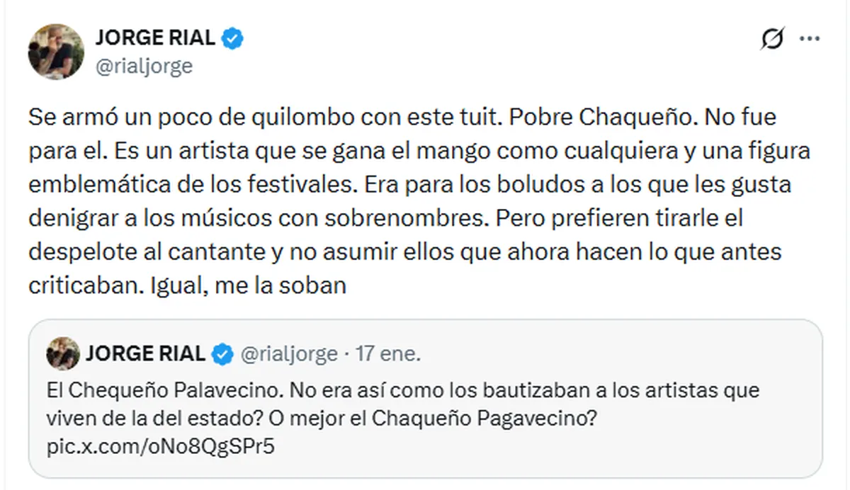 Más tarde, el periodista amplió su postura y explicó el sentido de su primer tuit: "Se armó un poco de quilombo con este tuit. Pobre Chaqueño, no fue para él. Es un artista que se gana el mango como cualquiera y una figura emblemática de los festivales. Era para los boludos a los que les gusta denigrar a los músicos con sobrenombres".