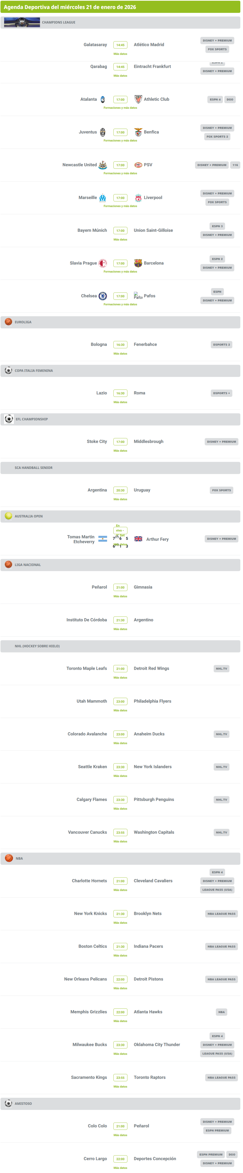 Agenda deportiva: hora y dónde ver los partidos de este 21 de enero Agenda deportiva: hora y dónde ver los partidos de este 21 de enero