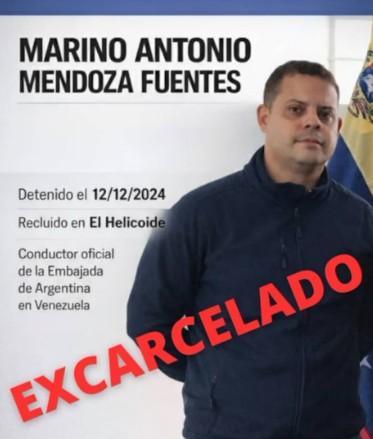Marino Antonio Mendoza, trabajador venezolano de la sede diplomática argentina, recuperó su libertad luego de haber sido arrestado en diciembre de 2024. Mendoza permanecía recluido en El Helicoide, el centro de detención más grande de Venezuela. La noticia fue confirmada por la activista opositora Elisa Trotta a través de su cuenta en la red social X.