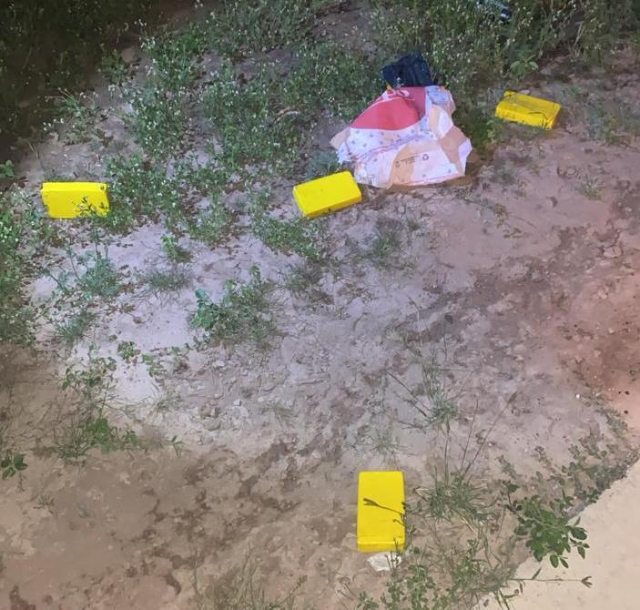Mientras el resto de los efectivos regresaron sobre el trayecto recorrido y en medio del monte a la vera del camino encontraron cuatro paquetes rectangulares de color amarillo envueltos con cinta adhesiva.