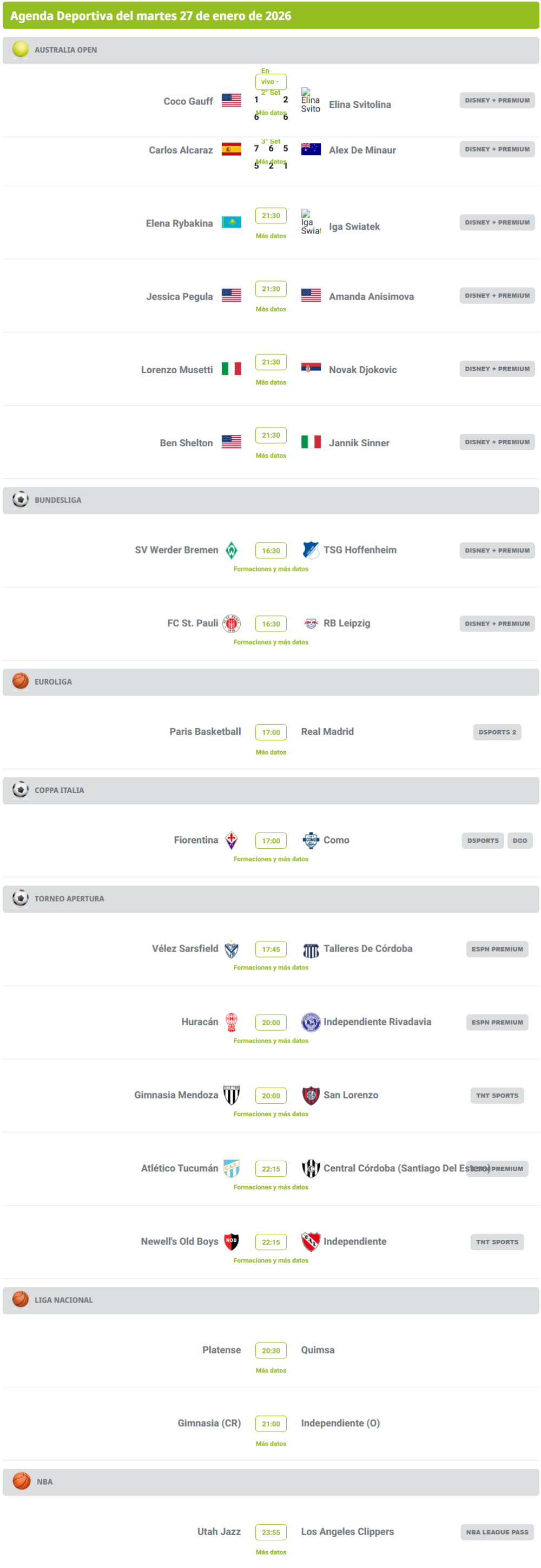 Agenda deportiva: hora y dónde ver los partidos de este 27 de enero Agenda deportiva: hora y dónde ver los partidos de este 27 de enero