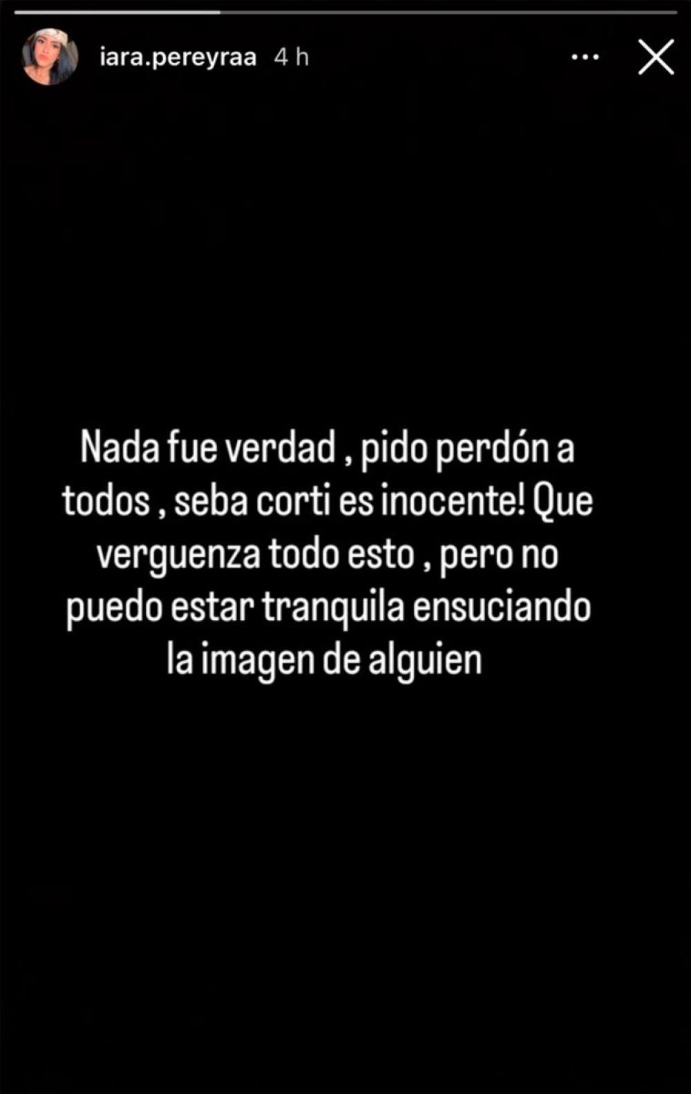 La publicación, que rápidamente se viralizó en el ámbito local, muestra un arrepentimiento explícito de la joven: "Pido perdón a todos. Qué vergüenza todo esto, pero no puedo estar tranquila ensuciando la imagen de alguien", escribió. En el mismo posteo, enfatizó que Corti es "inocente" y que los hechos que motivaron la investigación "no fueron verdad".