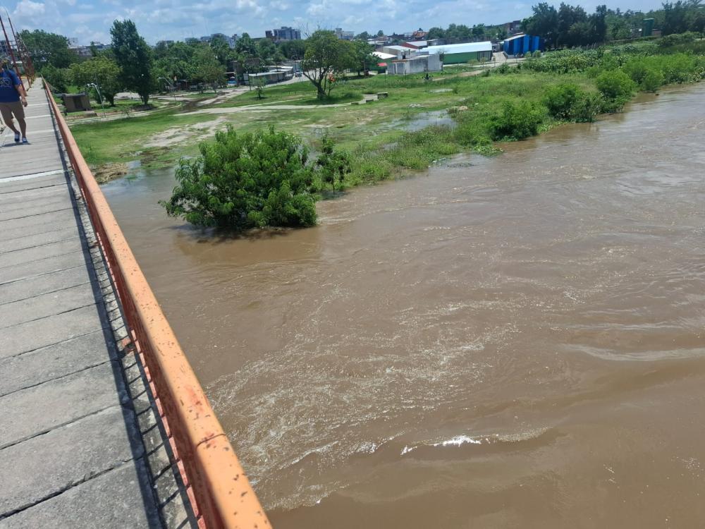 La erogación desde el Dique Frontal ayer a la tarde era de 973 m3/s, que de acuerdo con una tabla de Defensa Civil de la Municipalidad, eleva el nivel de alerta de amarillo a naranja. Ayer EL LIBERAL recorrió la zona y el agua del río se hallaba a escasos metros de la feria que se ubica en el sector bajo el puente.