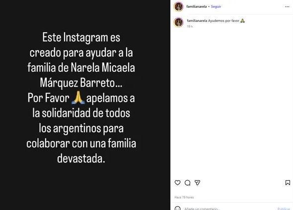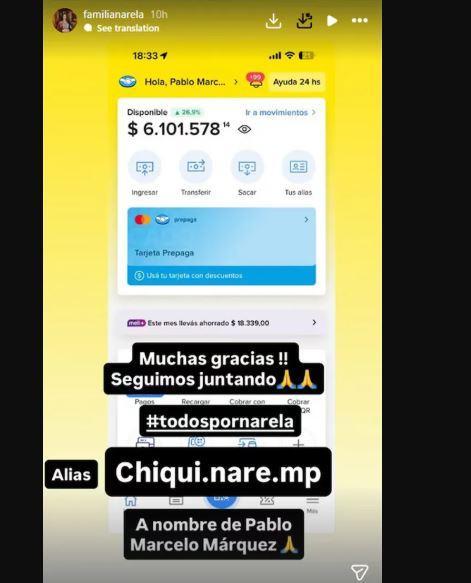 Ante esta difícil situación, la familia decidió iniciar una campaña solidaria y habilitó la cuenta de Instagram @familianarela, donde se difunden los datos para colaborar, mensajes de agradecimiento y actualizaciones sobre el avance de la colecta. También se dio a conocer el alias bancario chiqui.nare.mp para quienes deseen realizar aportes económicos.