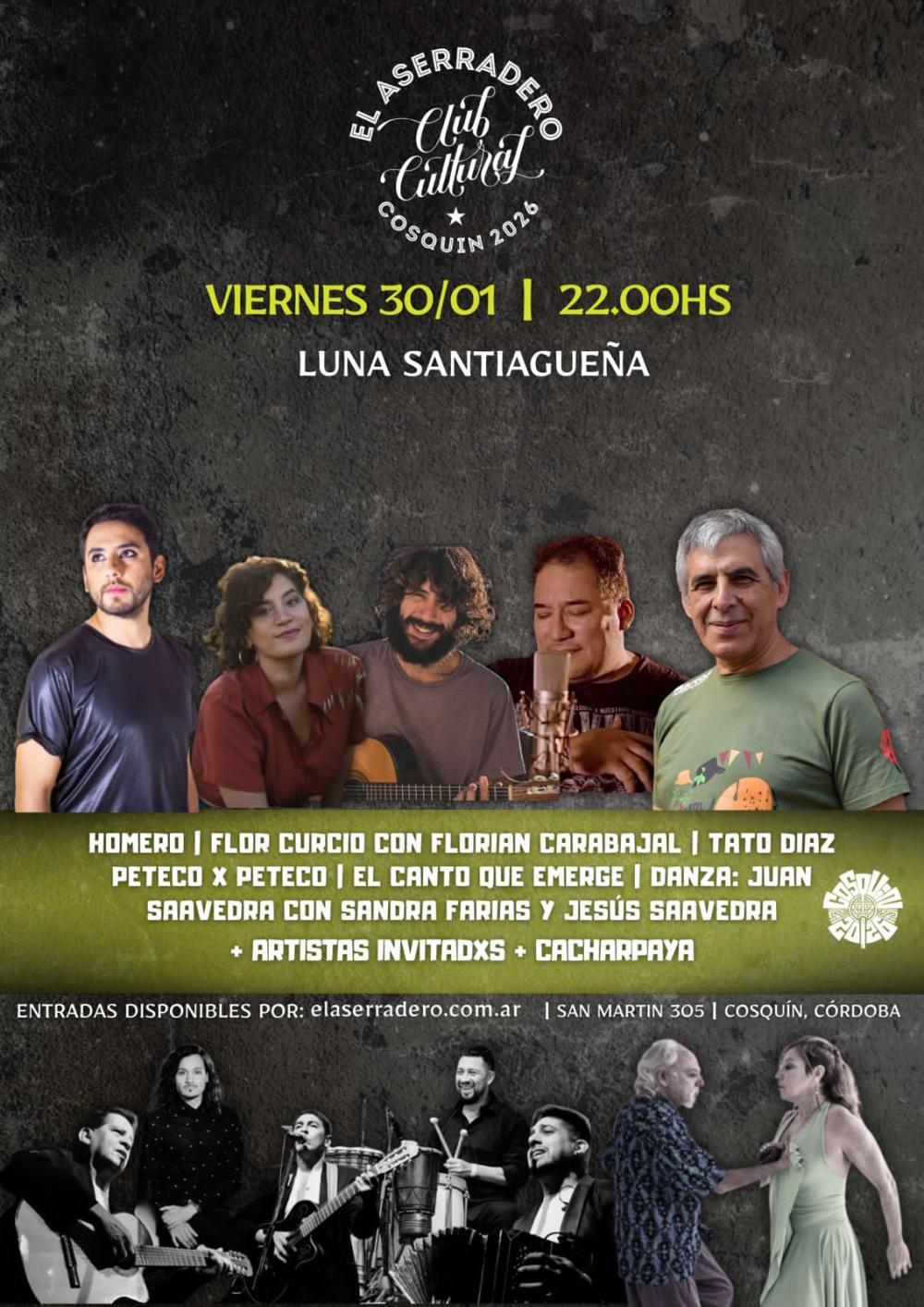 El Club Cultural El Aserradero continúa fortaleciendo su agenda con propuestas que ponen en valor las identidades provinciales. En ese marco, este viernes 30 de enero, desde las 22 horas, el espacio ubicado en San Martín 305, en la ciudad de Cosquín, Córdoba, será sede de Luna Santiagueña, una velada dedicada a la música y la danza de raíz santiagueña.