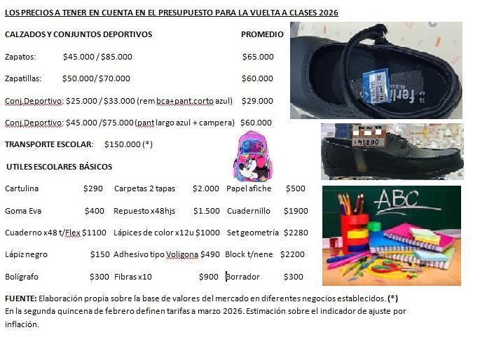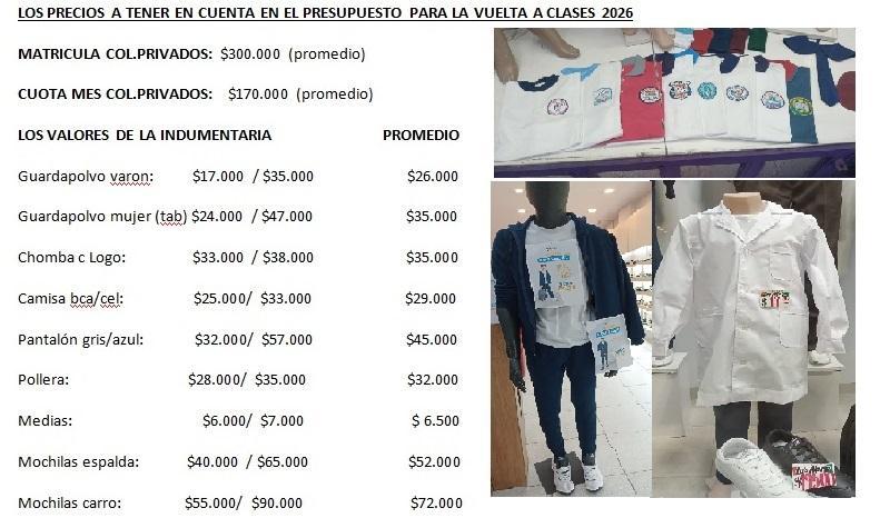 A su vez, quienes envían sus hijos a instituciones privadas, requerirán para el arranque de año entre matrícula, cuota, indumentaria, zapatos, útiles básicos, mochila y en el caso que utilice transporte escolar un monto promedio de $750.000.