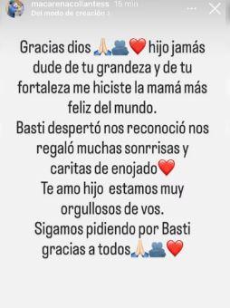 Macarena Collantes, madre del menor, publicó un emotivo mensaje en Instagram en el que relató el esperado momento: "Basti despertó, nos reconoció, nos regaló muchas sonrisas y también algunas caritas de enojo". Y agregó: "Te amo, hijo, estamos muy orgullosos de vos".