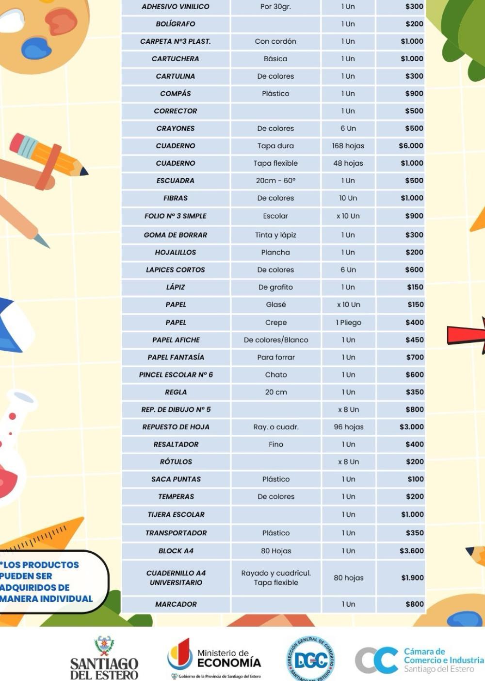 El Gobierno de la provincia, a través del Ministerio de Economía, dio a conocer el Listado de Precios Escolares Santiagueños Sugeridos, compuesto por 34 artículos que estarán disponibles desde este martes 10 de febrero hasta el 31 de marzo en librerías adheridas de ciudad Capital, La Banda, Frías, Termas de Río Hondo, Monte Quemado y Fernández.