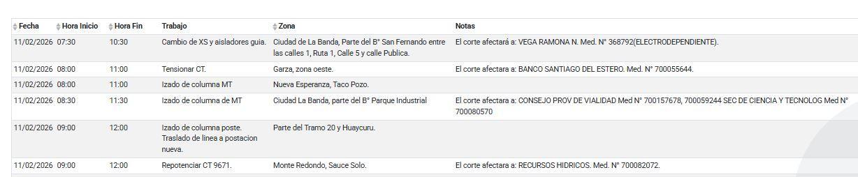 Este miércoles 11 de febrero se realizarán cortes programados de energía eléctrica en Santiago del Estero. La medida forma parte de tareas de mantenimiento y trabajos técnicos que la empresa distribuidora ejecutará para mejorar el servicio en distintos sectores de la provincia.