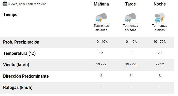 De acuerdo con el organismo nacional, se prevé un 40% de probabilidad de tormentas aisladas durante la mayor parte de la jornada, mientras que hacia la noche las condiciones podrían intensificarse, con un 70% de probabilidades de tormentas fuertes.