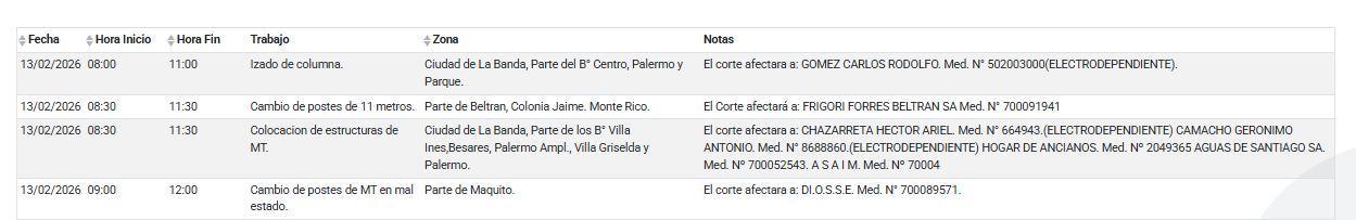 Este viernes 13 de febrero se realizarán cortes programados de energía eléctrica en Santiago del Estero. La medida forma parte de tareas de mantenimiento y trabajos técnicos que la empresa distribuidora ejecutará para mejorar el servicio en distintos sectores de la provincia.