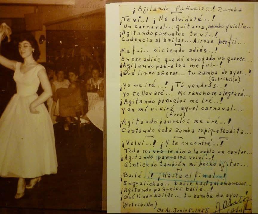 De esta manera, en su diálogo con EL LIBERAL, Marina fue introduciéndonos en la historia de "Agitando Pañuelos". Nos mostró una foto, documentos irrefutable del amor de Adolfo por Nancy: una foto en blanco y negro, en la que aparece bailando Nancy (fallecida hace un año y medio) y en su anverso, de puño y letra de Adolfo, la letra.