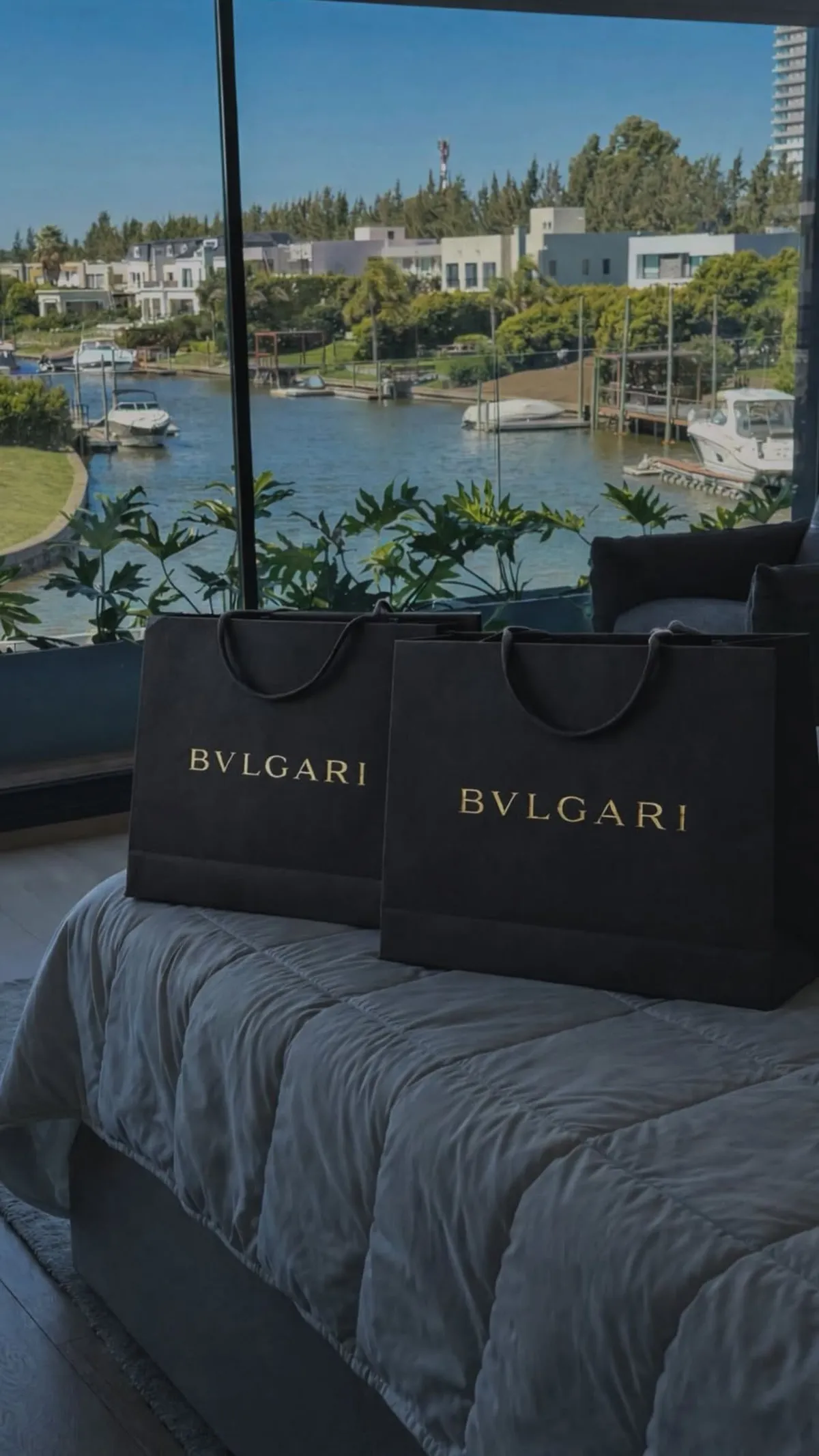 La imagen, tomada en la habitación de su casa en Nordelta con vista al lago, mostraba parte de la cama y, en primer plano, dos bolsas de la exclusiva firma Bulgari. Sin palabras ni aclaraciones, la postal dejó abierta la interpretación de sus seguidores.