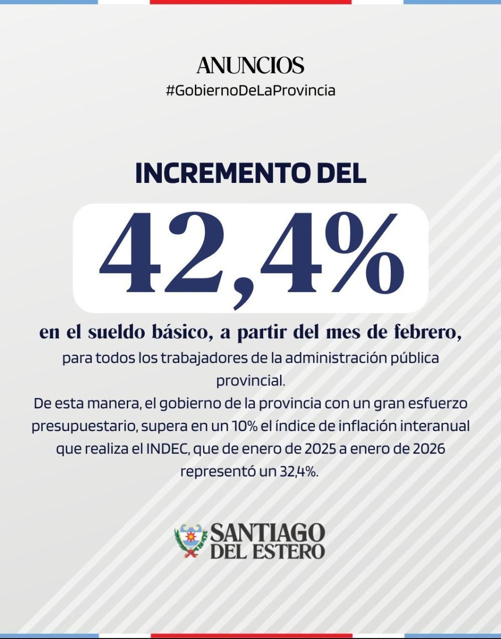 1.Incremento salarial del 42,4% en el sueldo básico, a partir del mes de febrero, para todos los trabajadores de la administración pública provincial. De esta manera, el gobierno de la provincia con un gran esfuerzo presupuestario, supera en un 10% el índice de inflación interanual que realiza el INDEC, que de enero de 2025 a enero de 2026 representó un 32,4%.