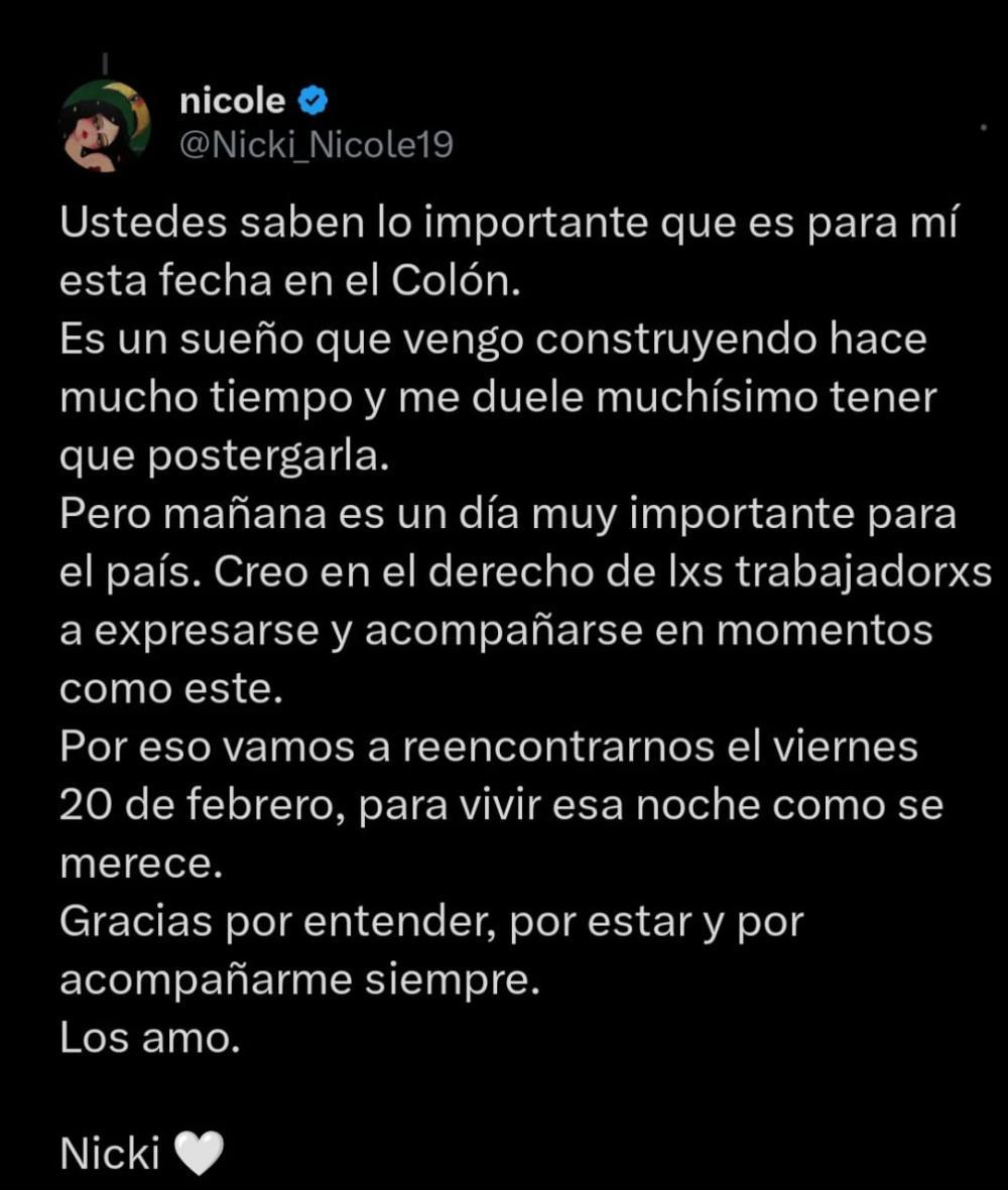 A través de sus redes sociales, Nicole explicó que la decisión no fue fácil, ya que se trata de un momento muy especial en su carrera, pero justificó el cambio por el contexto social actual. "Es un sueño que vengo construyendo hace mucho tiempo y me duele muchísimo tener que postergarlo, pero mañana es un día muy importante para el país", expresó, resaltando su apoyo al derecho de los trabajadores a expresarse en la jornada de protesta.