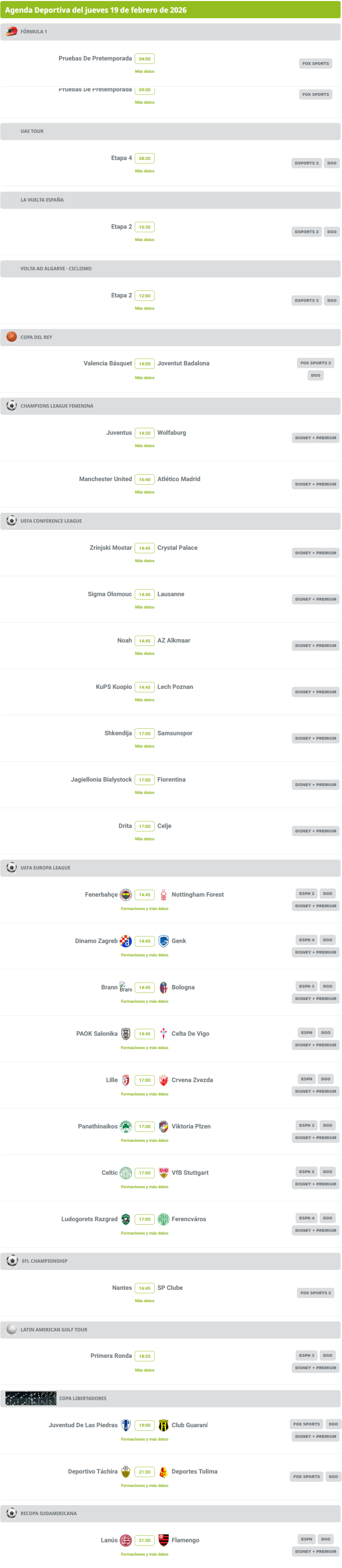 Agenda deportiva: hora y dónde ver los partidos de este 19 de febrero Agenda deportiva: hora y dónde ver los partidos de este 19 de febrero