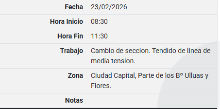 Cortes programados de electricidad para este 23 de febrero en Santiago del Estero: a qué hora y en qué barrios Cortes programados de electricidad para este 23 de febrero en Santiago del Estero: a qué hora y en qué barrios