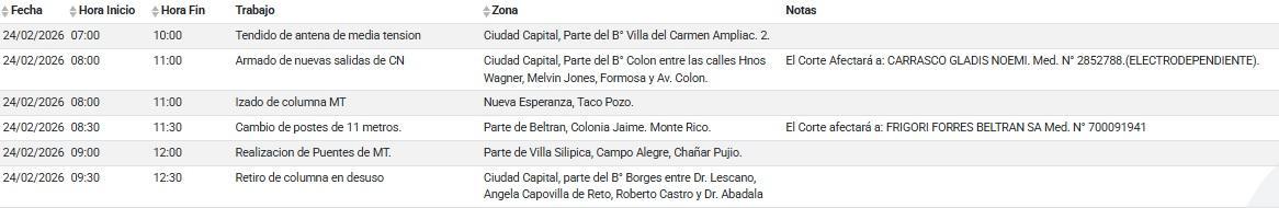 Este martes 24 de febrero se realizarán cortes programados de energía eléctrica en Santiago del Estero. La medida forma parte de tareas de mantenimiento y trabajos técnicos que la empresa distribuidora ejecutará para mejorar el servicio en distintos sectores de la provincia.