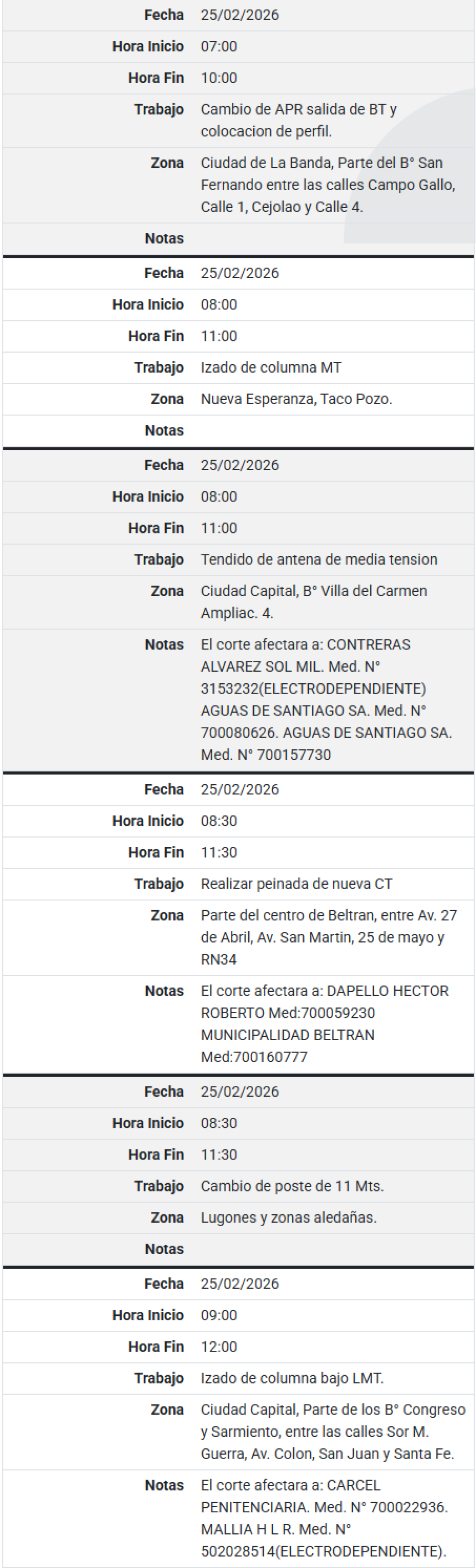 Cortes programados de electricidad para este 25 de febrero en Santiago del Estero: a qué hora y en qué barrios Cortes programados de electricidad para este 25 de febrero en Santiago del Estero: a qué hora y en qué barrios