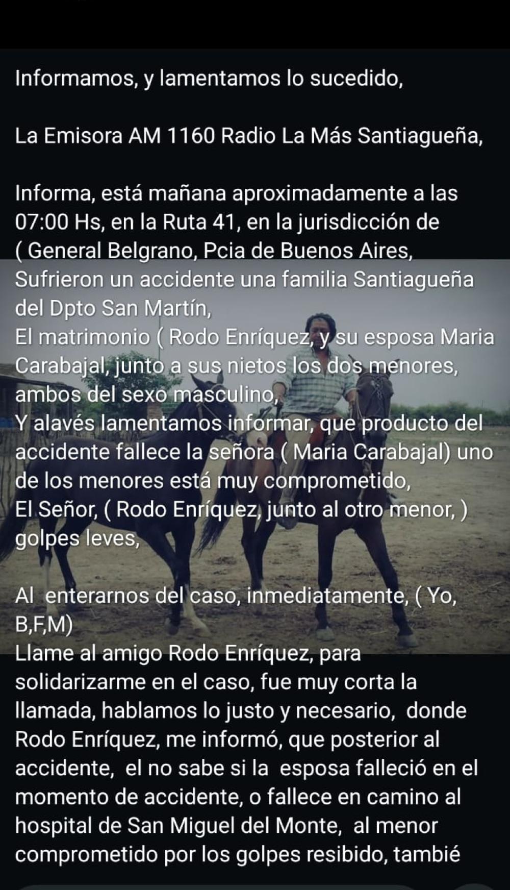 Lo acompañaban: María del Carmen Carabajal, quien falleció, y sus nietos de 11 años (politraumatismos graves) y de (7 años), con politraumatismos leves.