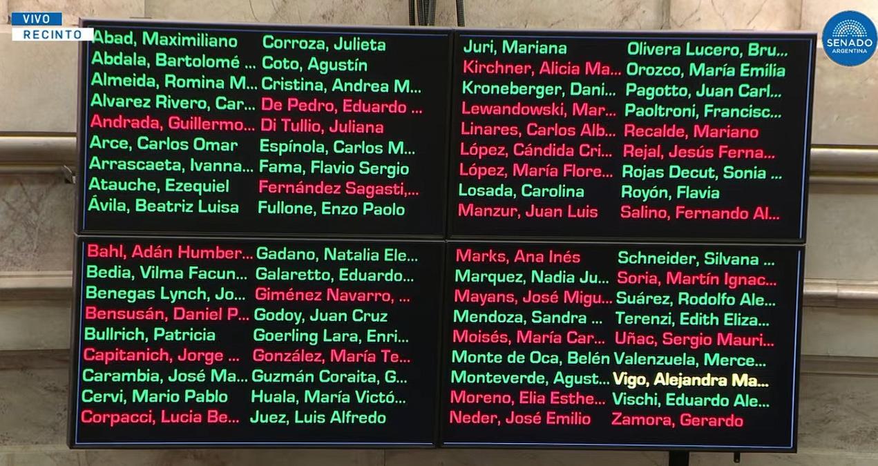 La Cámara alta reflejó la polarización del debate, aunque el oficialismo logró una diferencia cómoda en la votación general. La votación resultó 44 votos positivos, 27 negativos, y una abstención.