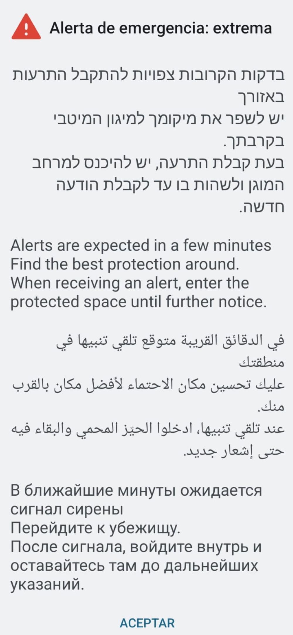 Mondschein explicó que Israel cuenta con un sofisticado sistema de advertencias que se envía directamente a los teléfonos celulares. "Las alertas son esperadas en los próximos minutos. Busca un mejor lugar para refugiarse Cuando se reciba la alerta, entra a un espacio protegido hasta una próxima noticia", detalló.