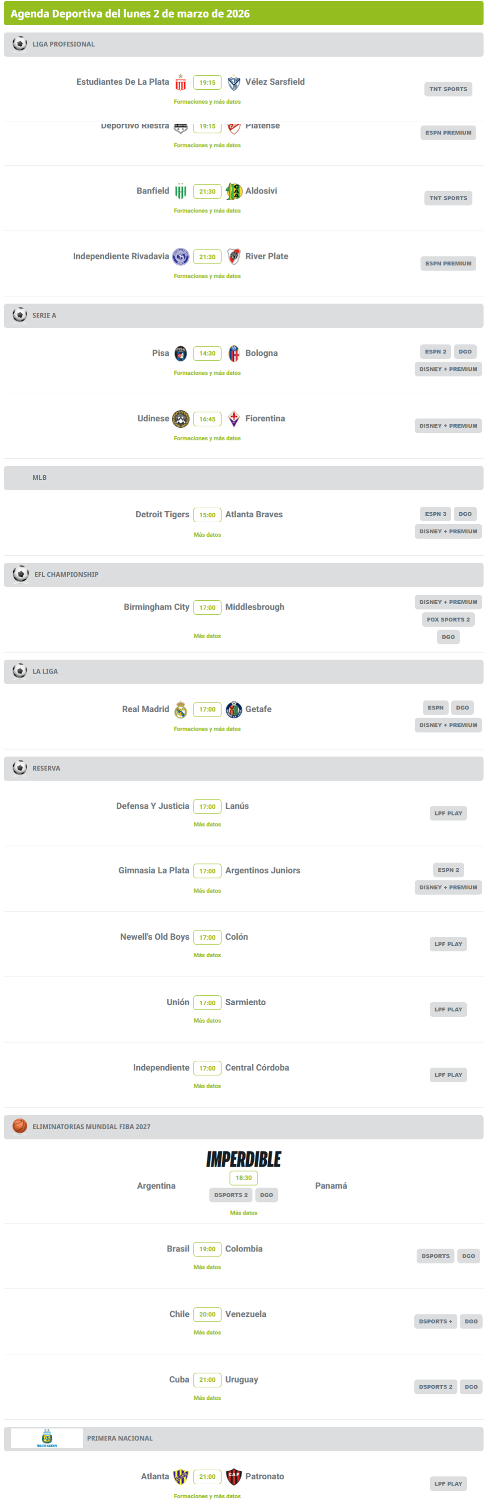 Agenda deportiva: hora y dónde ver los partidos de este 2 de marzo Agenda deportiva: hora y dónde ver los partidos de este 2 de marzo