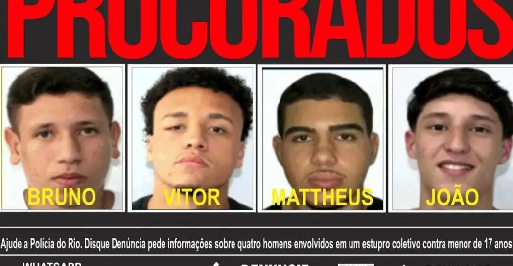 La Policía Civil de Río de Janeiro identificó a los cuatro mayores de edad responsables del ataque. Sobre ellos pesan órdenes de captura por violación de vulnerable y lesiones: Bruno Felipe dos Santos Allegretti (18), João Gabriel Xavier Bertho (19) prófugo, Mattheus Verissimo Zoel Martins (19) prófugo, Vitor Hugo Oliveira Simonin (18), prófugo