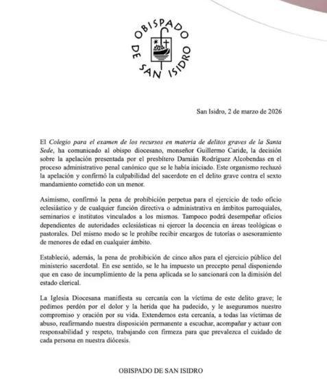 Rodríguez Alcobendas, de 68 años y conocido como el "padre Damián", fue condenado por el "delito grave contra el sexto mandamiento cometido con un menor", una carátula que en el derecho canónico refiere a una falta seria de índole sexual. Así lo informó el Obispado de San Isidro en un comunicado oficial, en el que detalló las penas impuestas por la Santa Sede.