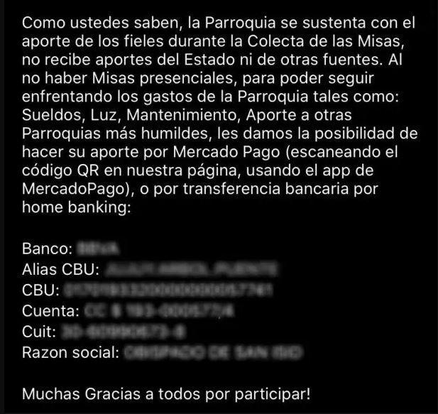 En otro comunicado, ante la imposibilidad de realizar colectas presenciales durante las misas, solicitó a los fieles donaciones mediante código QR o transferencias bancarias incluyendo CVU para afrontar gastos parroquiales como sueldos, servicios y aportes a otras comunidades más humildes.