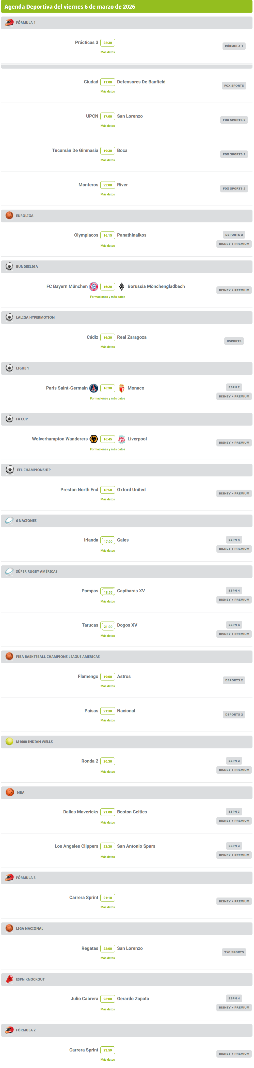 Agenda deportiva: hora y dónde ver los partidos de este 6 de marzo Agenda deportiva: hora y dónde ver los partidos de este 6 de marzo