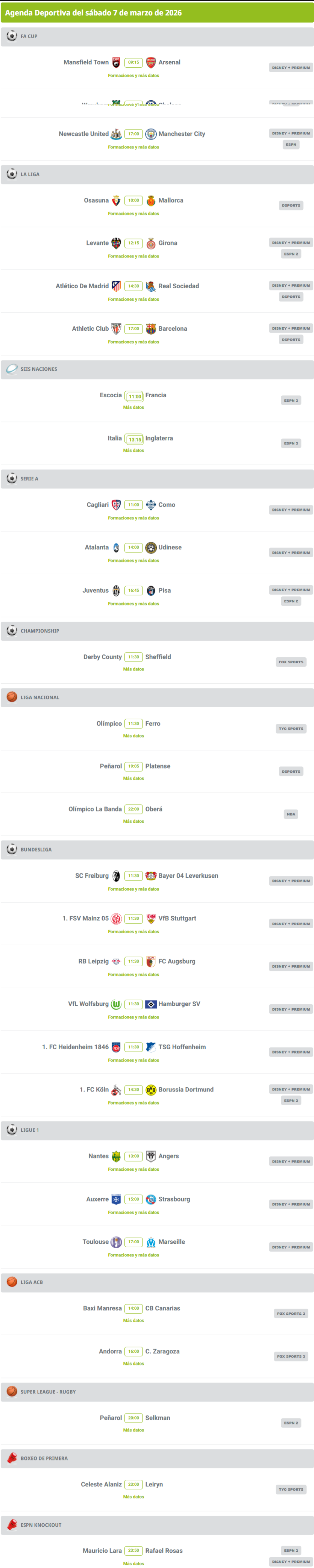 Agenda deportiva: hora y dónde ver los partidos de este 7 de marzo Agenda deportiva: hora y dónde ver los partidos de este 7 de marzo