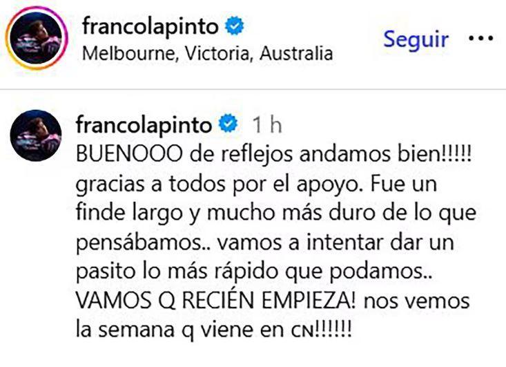 "BUENOOO de reflejos andamos bien!!!!! gracias a todos por el apoyo. Fue un finde largo y mucho más duro de lo que pensábamos... Vamos a intentar dar un pasito lo más rápido que podamos... ¡VAMOS QUE RECIÉN EMPIEZA! Nos vemos la semana que viene en China!!!!!!", escribió el piloto, en un mensaje que en menos de una hora superó los 70 mil "me gusta".