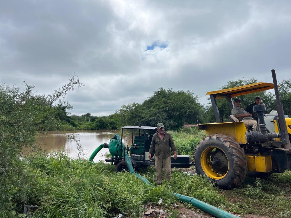 Personal de la Municipalidad de Monte Quemado se encuentra realizando tareas de desagote en el reservorio "La Balastrera", utilizando una motobomba de 6 pulgadas para disminuir el nivel del canal de desagüe.