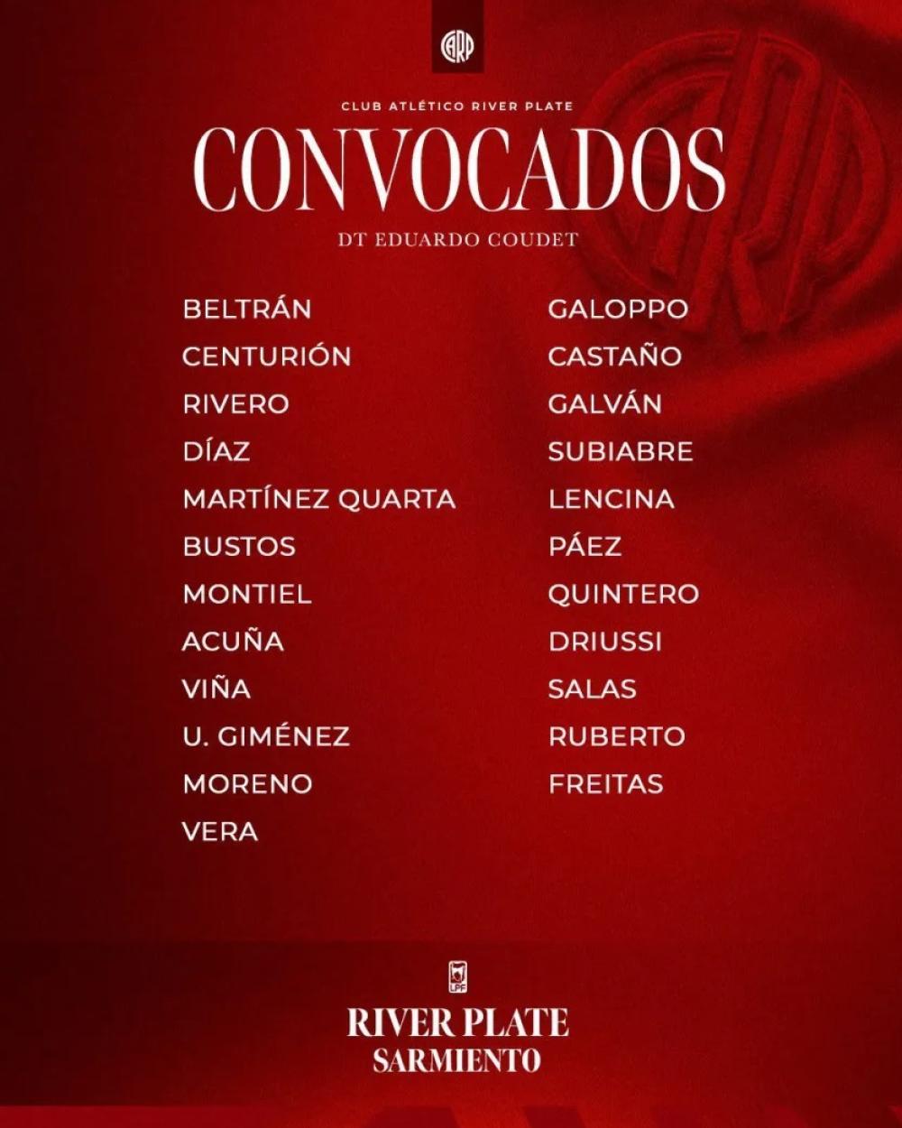 Santiago Beltrán; Gonzalo Montiel, Lucas Martínez Quarta, Lautaro Rivero, Marcos Acuña; Aníbal Moreno, Fausto Vera; Kendry Páez o Juan Fernando Quintero, Tomás Galván o Juan Fernando Quintero, Ian Subiabre o Joaquín Freitas; Sebastián Driussi. DT: Eduardo Coudet.