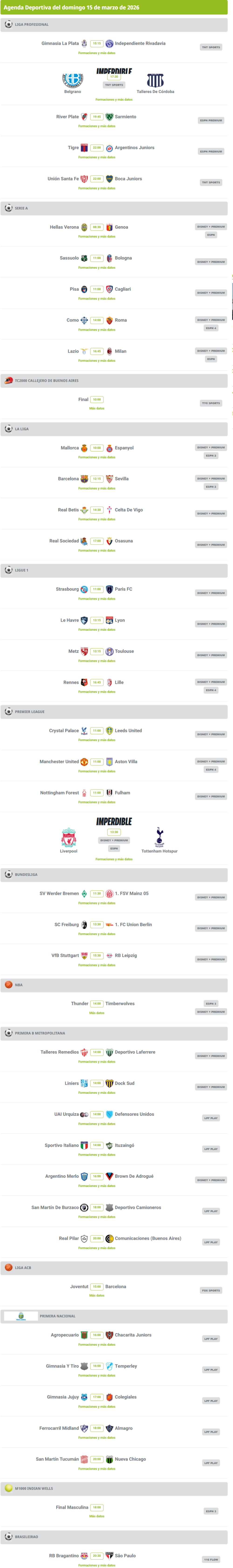 Agenda deportiva: hora y dónde ver los partidos de este 15 de marzo Agenda deportiva: hora y dónde ver los partidos de este 15 de marzo