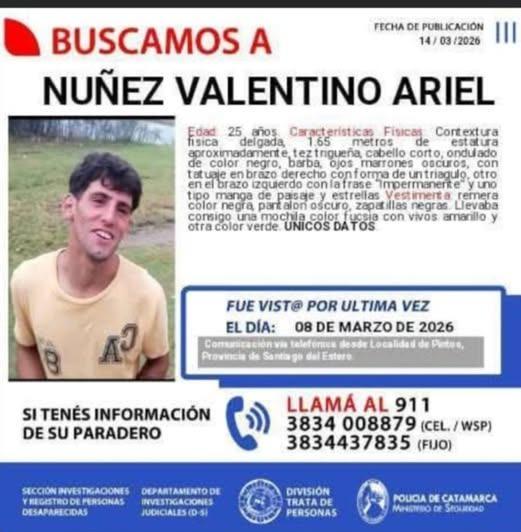 La desaparición de Valentino Córdoba, un joven de 26 años oriundo de Las Parejas, Santa Fe, ha generado creciente preocupación entre su familia, amigos y vecinos. Valentino fue visto por última vez el 7 de marzo en la localidad santiagueña de Pinto, justo el día de su cumpleaños, y desde entonces su paradero se ha mantenido como un verdadero misterio. Según relató su madre, Lorena Córdoba, a EL LIBERAL, Valentino había viajado a Las Parejas en busca de trabajo, pero debido a la distancia y la nostalgia por su familia decidió regresar a Santa María, Catamarca, donde se encuentra su pareja y su hijo de apenas cuatro meses.